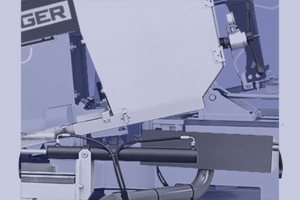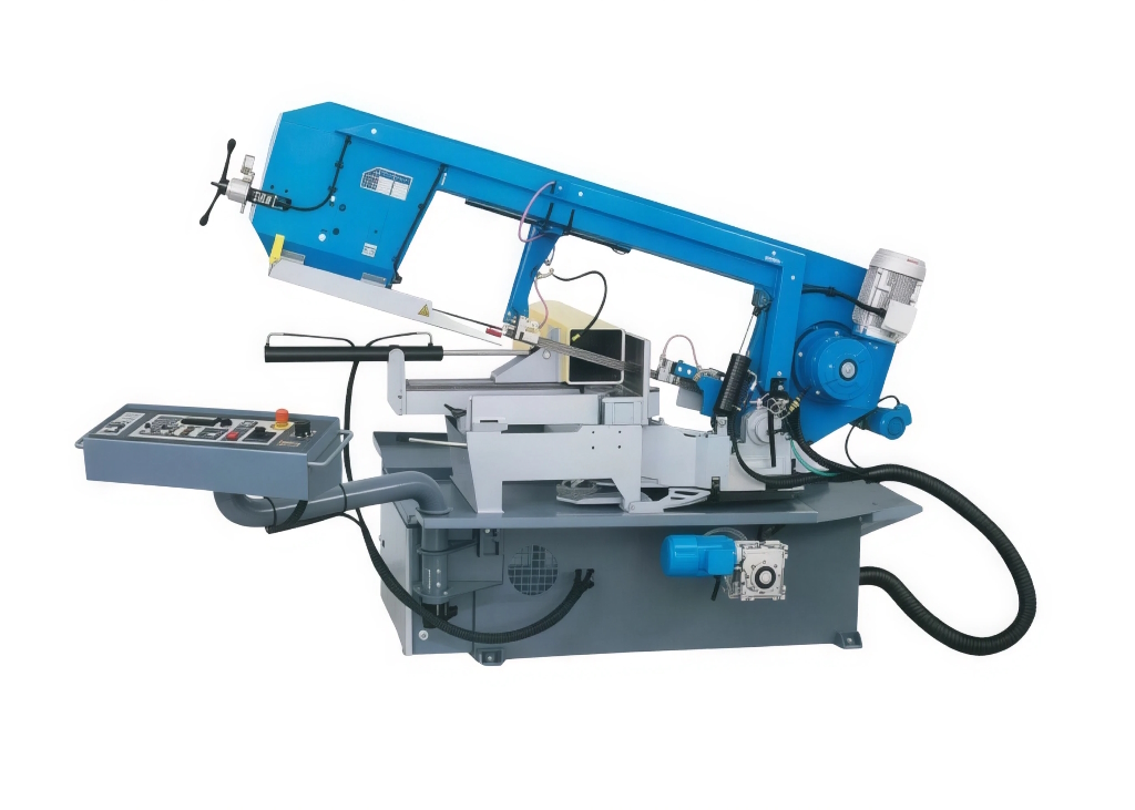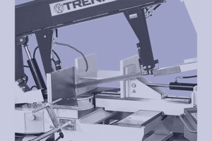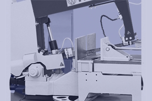 Подвійна стрічкова пилка для торцювання, ручна або напівавтоматична, з додатковим пристроєм керування тиском різання.